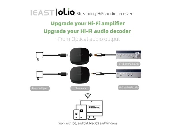 OLiOstream støtter opptil 24-bit/192 kHz og kan inngå i et multiroom-oppsett med andre iEast-enheter. Spill samme musikk i flere rom eller ulike sanger i hvert rom, alt styrt fra én app.